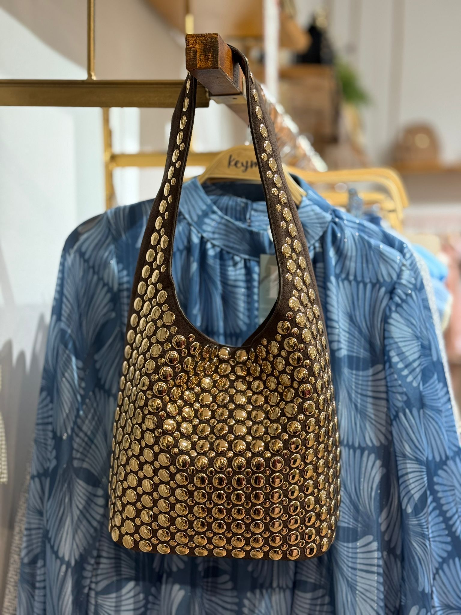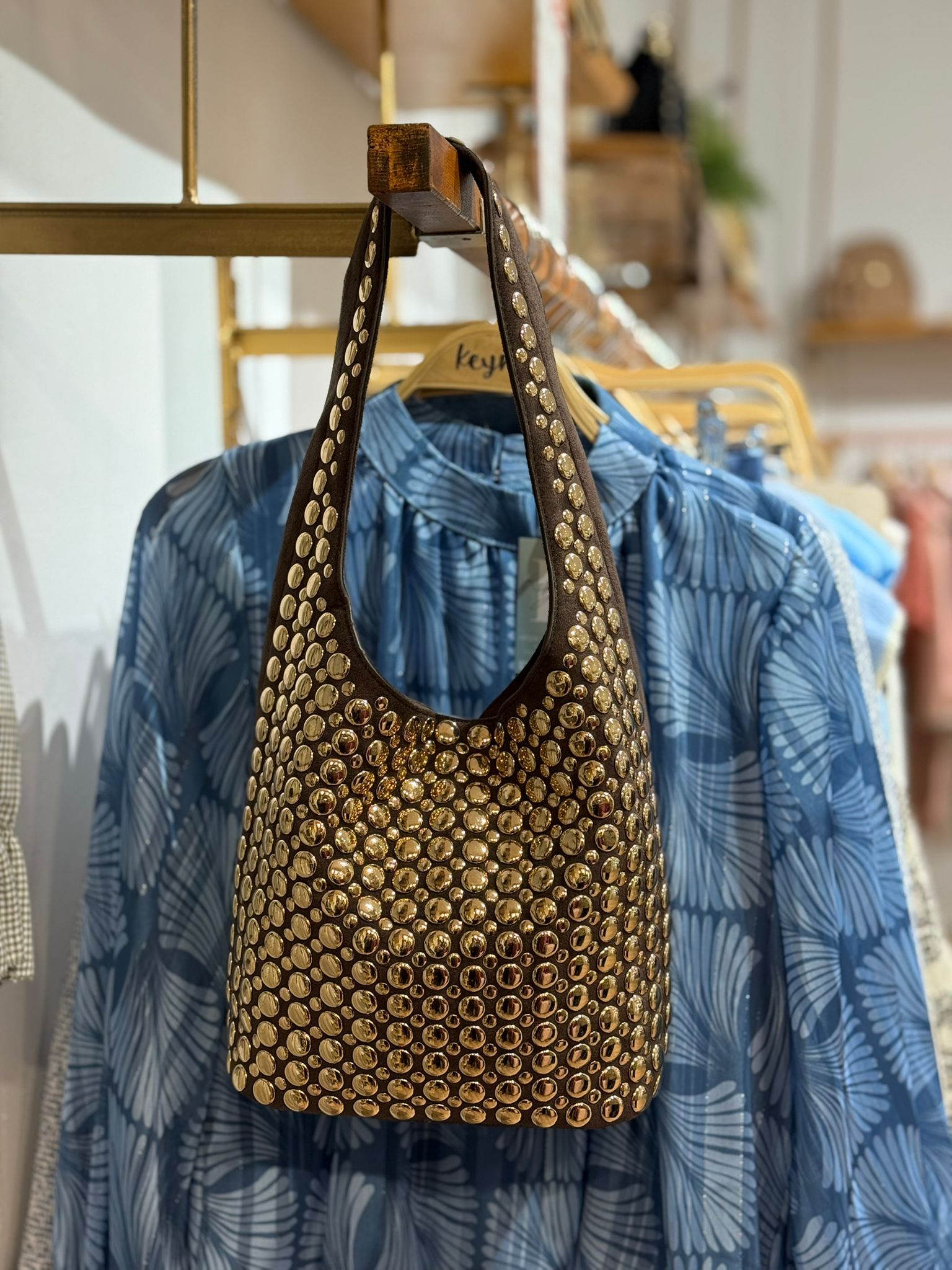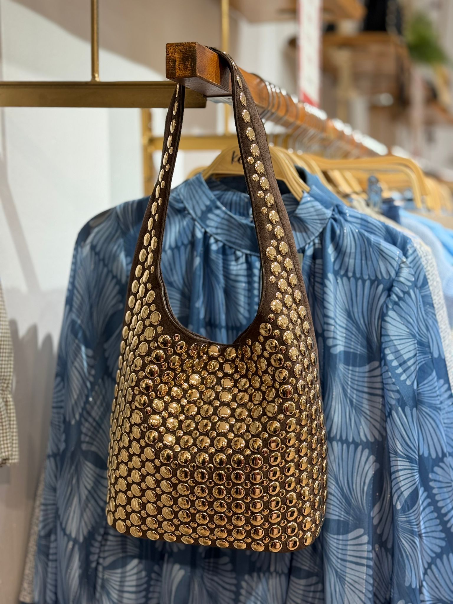 Bolso de hombro en antelina marrón oscuro de tacto suave, ideal para aportar calidez y estilo a cualquier conjunto. Su diseño se completa con detalles de tachuelas metÔlicas que envuelven todo el bolso, la parte trasera es totalmente liso. Un bolso actual y sofisticado sin perder elegancia. PrÔctico y cómodo, es perfecto para el uso diario gracias a su tamaño funcional. Un complemento versÔtil que encaja tanto con looks casuales como con outfits mÔs especiales, convirtiéndose en un bÔsico imprescindible en tu armario.