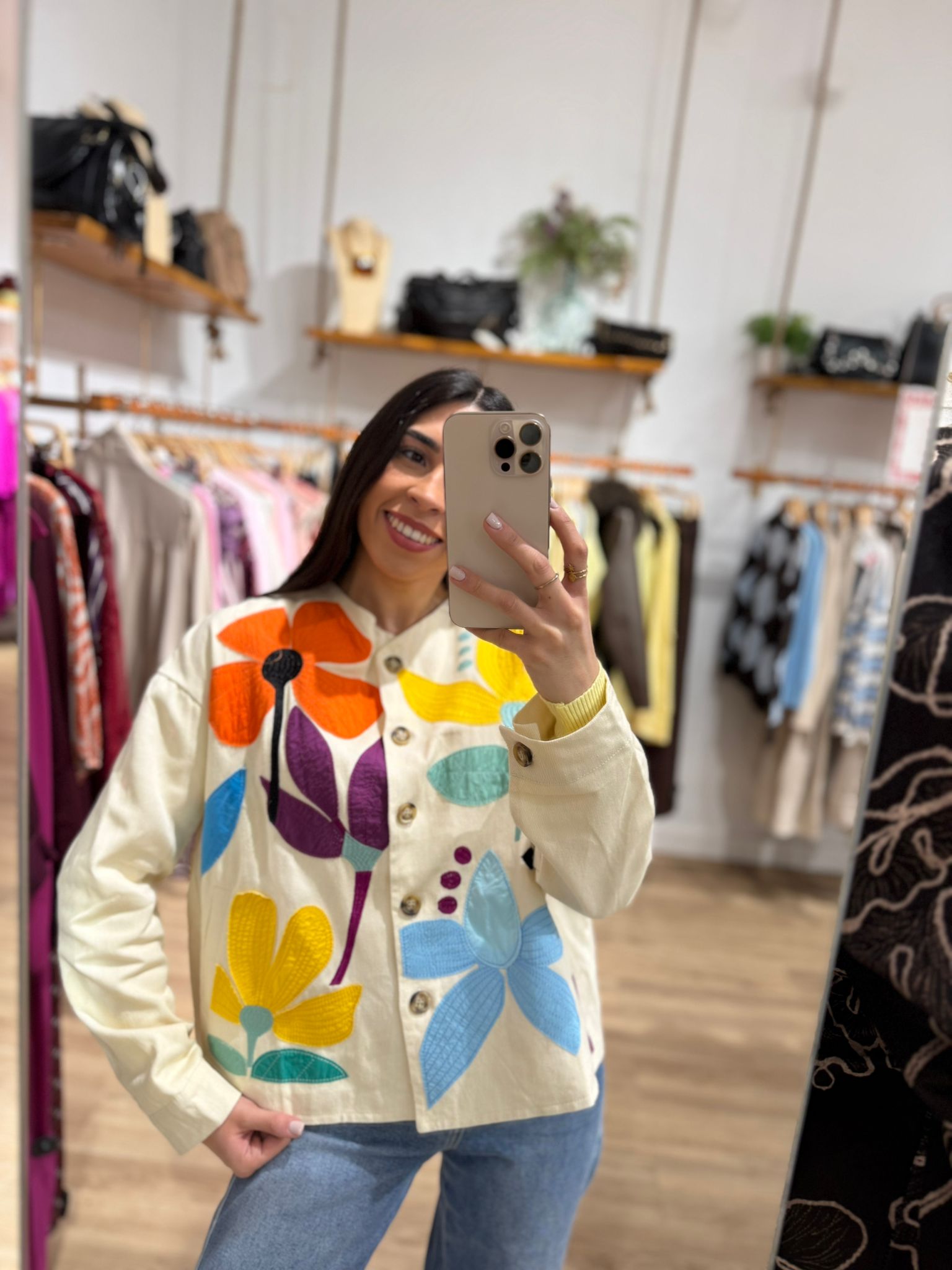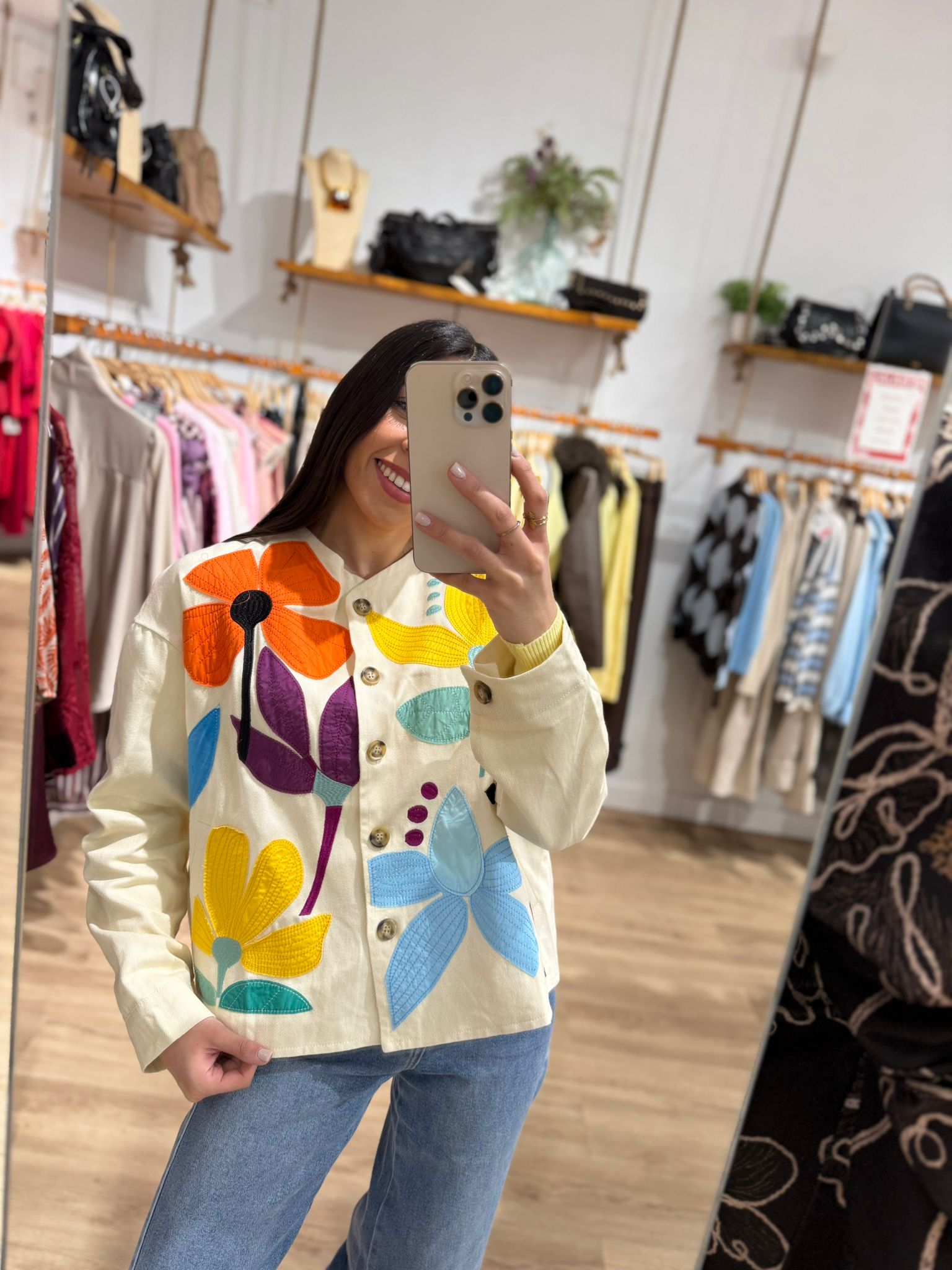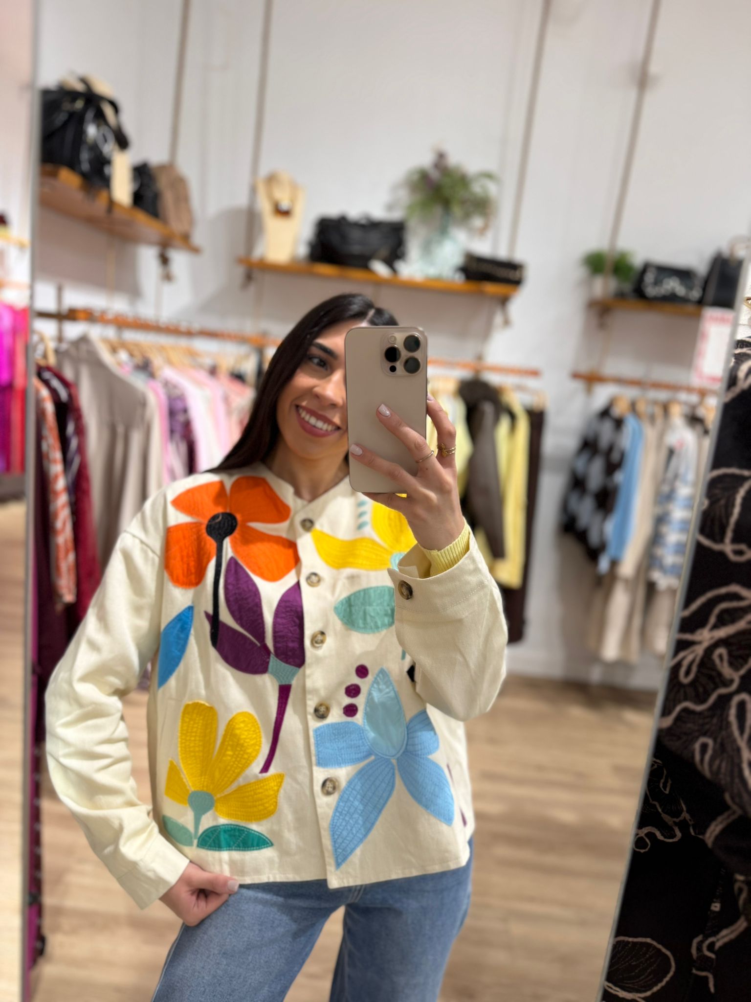 Chaqueta de flores con diseƱo bordado multicolor que aporta un toque alegre y original a cualquier look. Confeccionada en tejido ligero y agradable, cuenta con cierre frontal de botones y un corte cómodo, perfecto para el dĆa a dĆa. Una prenda especial que eleva outfits bĆ”sicos y se convierte en la protagonista del conjunto.