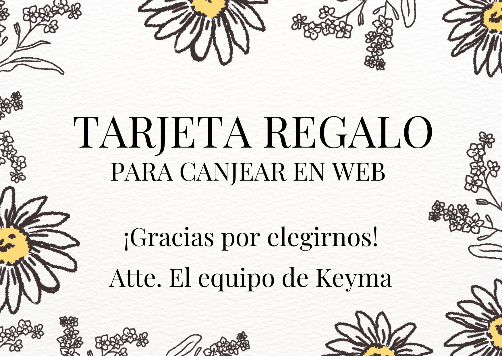 La Tarjeta Regalo otorga exclusivamente a su tenedor la posibilidad de adquirir, en función del saldo existente en la misma, una o varias prendas y/o accesorios que en ese momento estén a la venta en keyma.es y en nuestra tienda fisica en Avda. Manuel Reina, 2 de Puente Genil (Córdoba). Sólo se podrá usar una Tarjeta Regalo por pedido como forma de pago y no serán acumulables con otros descuentos promocionales.