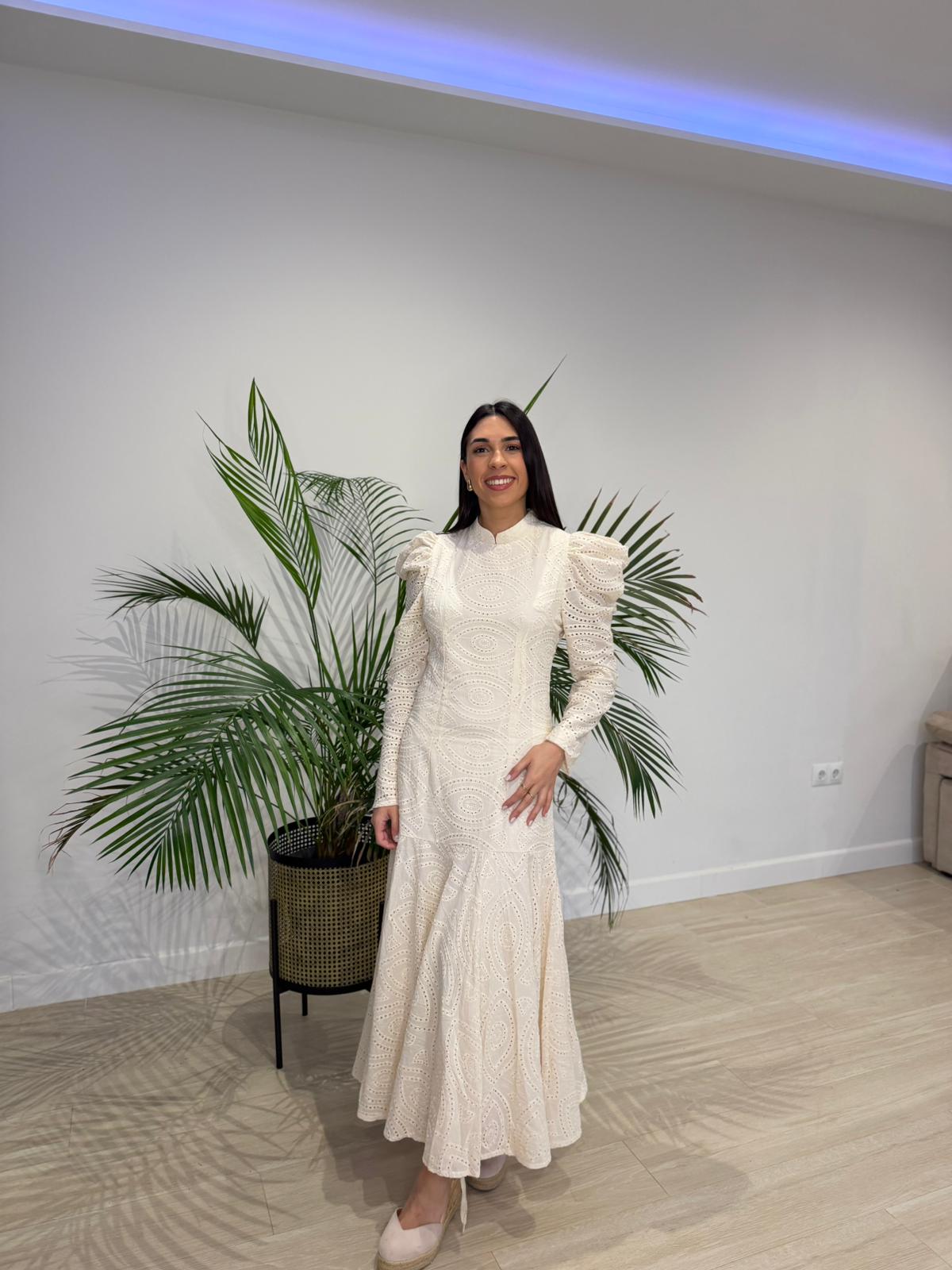 Vestido largo beig de inspiración romántica y sofisticada, confeccionado en delicado tejido bordado con motivos geométricos que aportan textura y un acabado exclusivo.